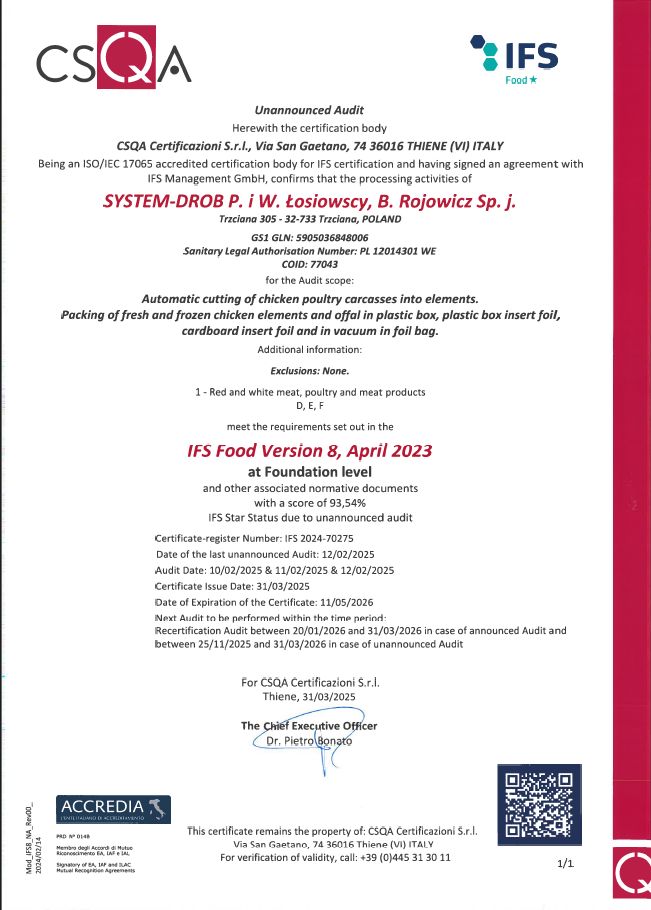 jest gwarancją wysokiej jakości wyrobów produkowanych przez SYSTEM-DROB. Podczas całego procesu uboju i rozbioru rygorystycznie przestrzegane są wymagania przepisów prawnych, zasady dobrych praktyk produkcyjnych i higienicznych GMP/GHP oraz wymagania systemu HACCP.